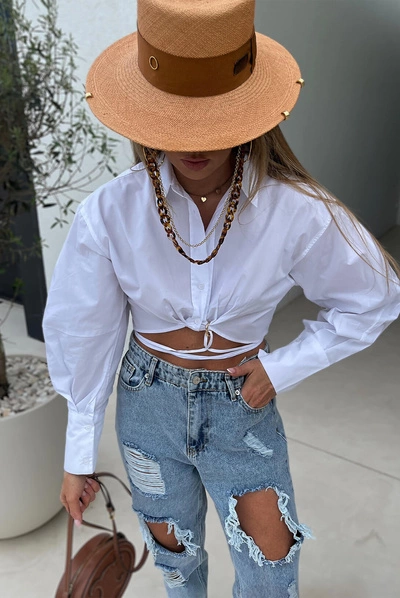 Sheila - Women's white long-cut shirt with 'Gizem' ties