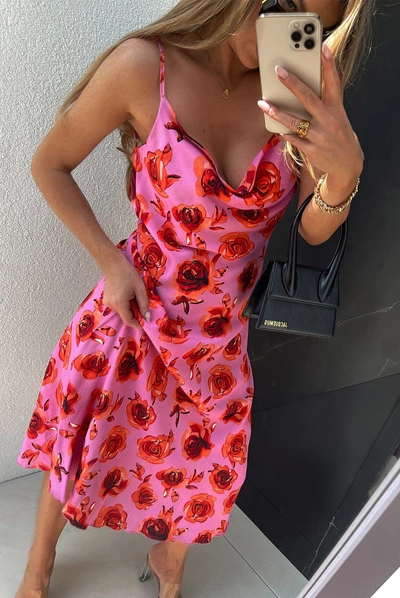 Sheila - Women's pink dress with red flowers and cut-out mini casual 'Flowerbomb'