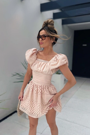 Sheila - Women's beige openwork dress with handmade boho mini roses 'Sanah'