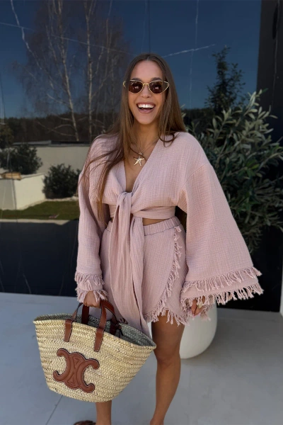Sheila- Damski Komplet różowy dwuczęściowy z frędzlami i długim rękawem boho 'Palamas'