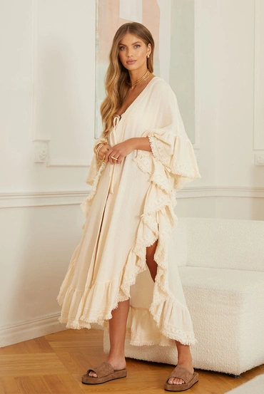 Sheila - Damska Narzutka kremowa/ecru z falbanami i frędzlami boho 'Noel'