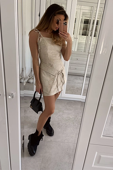 Sheila - Damska Sukienka beżowa lniana z naramkami mini 'Atena'